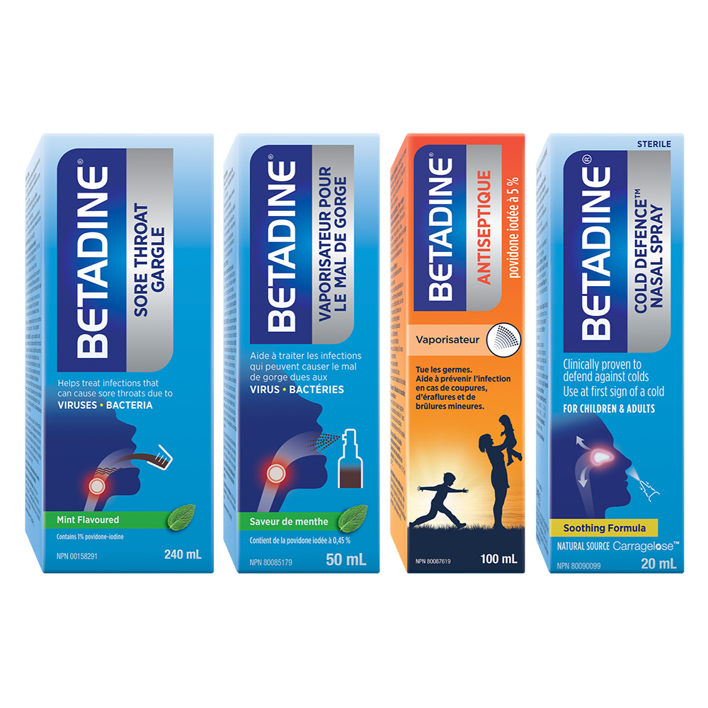 Betadine Cold Nasal Spray is clinically proven to shorten the duration of a cold when used at the first sign; Sore Throat Spray treats infections that can cause sore throats due to viruses and bacteria. Sore Thorat Gargle: treats infections that can cause sore throats due to viruses and bacteria.